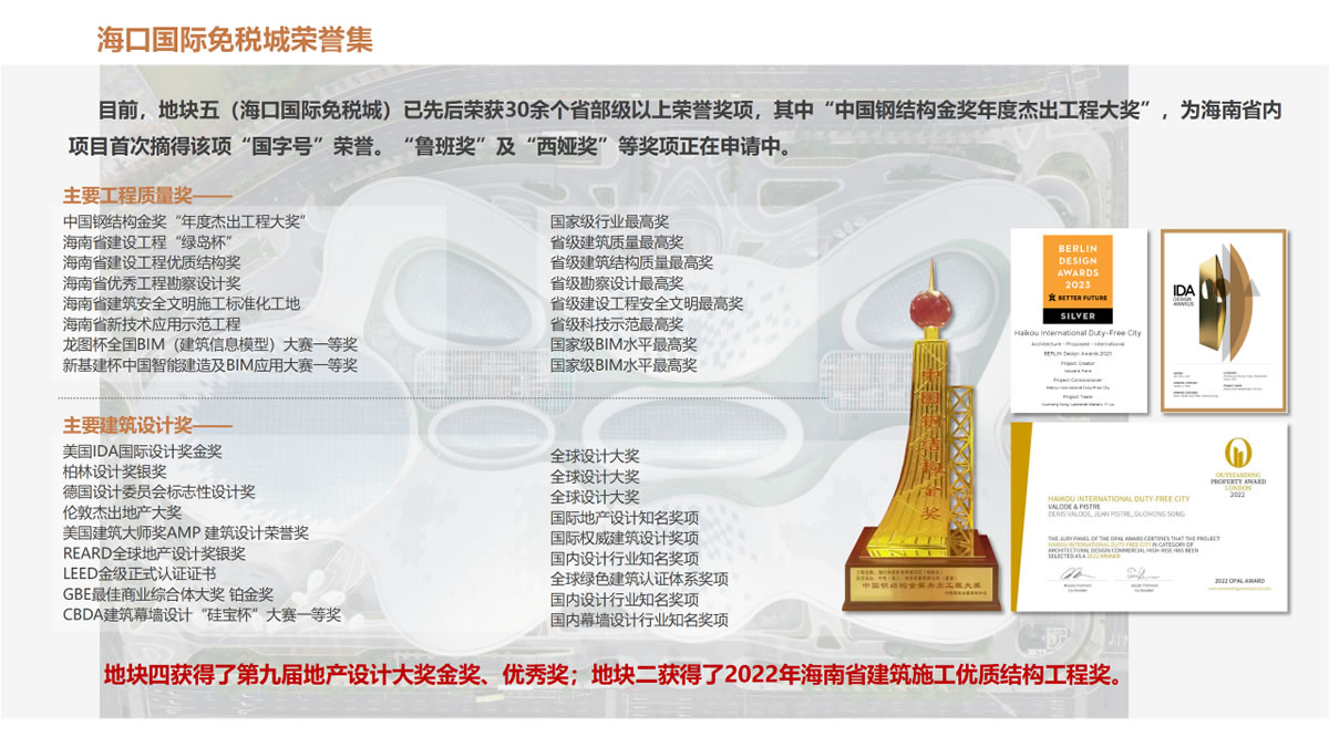 ▲ 海口國際免稅城項目整體建設(shè)所獲榮譽