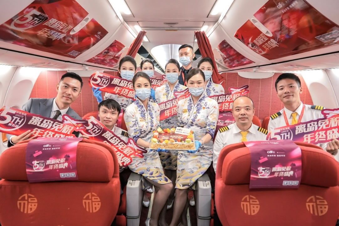 中免集團聯(lián)動航空資源推出主題航班活動,帶來了沉浸式的新鮮有趣互動體驗。11月15日,cdf海口國際免稅城聯(lián)合cdf??谌赵聫V場免稅店、cdf??诿捞m機場免稅店,聯(lián)動海南航空,于HU7782北京-??诤桨嗌祥_展主題航班活動,通過營造節(jié)慶氛圍,開展互動問答等趣味活動,與機上旅客積極互動,并予以乘坐該航班旅客相應購物權益。cdf三亞國際免稅城也在HO1747南京—三亞的吉祥航空主題航班上為乘客精心準備了主題蛋糕及消費權益,在豐富乘機體驗的同時,更增強旅客對于免稅及活動的了解。