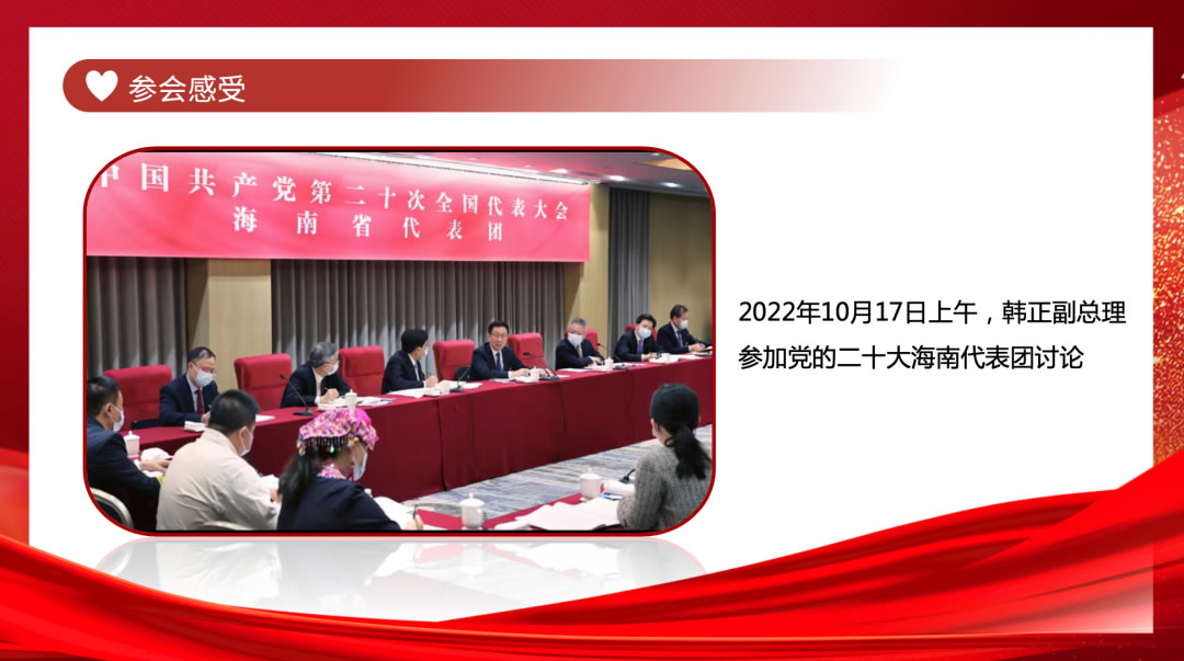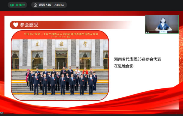 宣講會(huì)上,她分享了參加黨的二十大的所見所聞所感,并從新時(shí)代青年、基層黨員、海南旅游零售行業(yè)從業(yè)者三個(gè)身份,就如何貫徹黨的二十大精神分享學(xué)習(xí)體會(huì)。