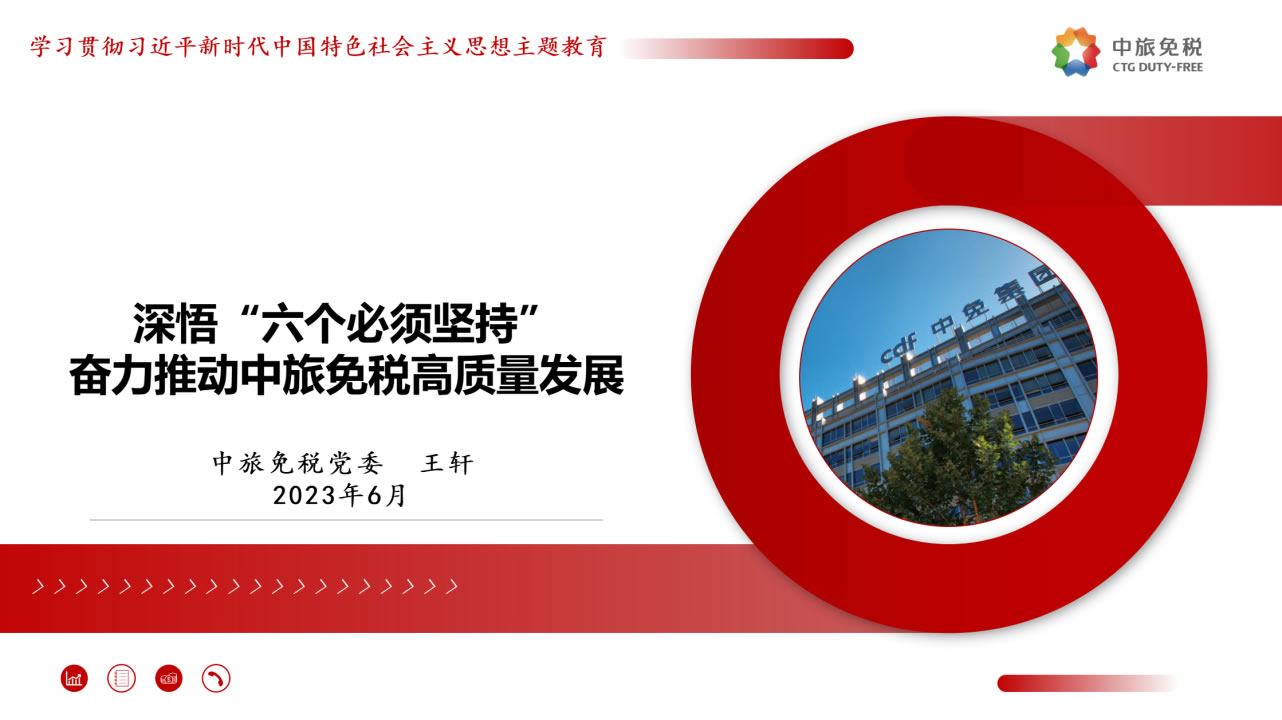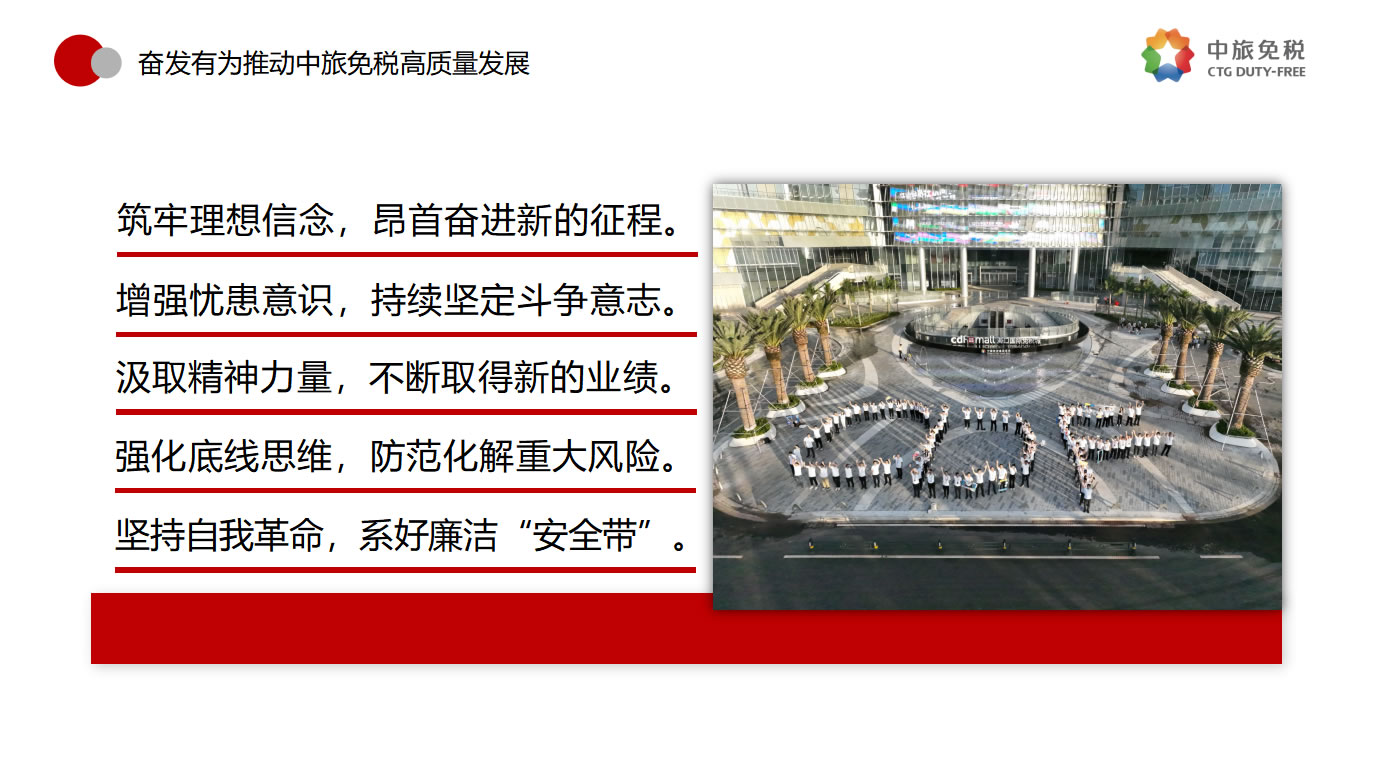 一是筑牢理想信念,昂首奮進(jìn)新的征程。要堅決貫徹落實總書記指示,優(yōu)化發(fā)展方式,注重發(fā)展品質(zhì),追求質(zhì)量更優(yōu)、效益更好、效率更高的可持續(xù)增長,做強(qiáng)做優(yōu)公司核心競爭優(yōu)勢,全面提升公司經(jīng)營發(fā)展的系統(tǒng)能力。二是增強(qiáng)憂患意識,持續(xù)堅定斗爭意志。要進(jìn)一步強(qiáng)化危機(jī)意識、憂患意識,主動擔(dān)責(zé)、主動擔(dān)難、主動擔(dān)險,以強(qiáng)烈的使命感和責(zé)任感,統(tǒng)一思想、統(tǒng)一意志、統(tǒng)一行動。三是汲取精神力量,不斷取得新的業(yè)績。要以“紅色引擎 免稅先鋒”“海棠精神”“紅帆工程”等黨建品牌活動為切入點,進(jìn)一步提升基層黨組織的組織力,通過共建活動平臺、分享工作資源、交流工作經(jīng)驗、解決實際問題等途徑,實現(xiàn)黨的建設(shè)與業(yè)務(wù)發(fā)展建設(shè)良性互動,以深入推進(jìn)全面從嚴(yán)治黨引領(lǐng)保障高質(zhì)量發(fā)展。四是強(qiáng)化底線思維,防范化解重大風(fēng)險。要深刻領(lǐng)會習(xí)近平總書記關(guān)于強(qiáng)化底線思維,防范化解重大風(fēng)險的重要論述,充分認(rèn)清當(dāng)前面臨的形勢任務(wù),系統(tǒng)梳理查找存在的突出風(fēng)險問題,自覺從習(xí)近平新時代中國特色社會主義思想中找到破解矛盾問題的鑰匙,努力在新思想指引下探索推動高質(zhì)量發(fā)展的路徑。五是堅持自我革命,系好廉潔的“安全帶”。要繼續(xù)發(fā)揚自我革命精神,縱深推進(jìn)黨風(fēng)廉政建設(shè)和反腐敗斗爭,一體推進(jìn)“不敢腐、不能腐、不想腐”,圍繞財經(jīng)領(lǐng)域?qū)m椪蔚戎攸c問題、緊盯海南地區(qū)所屬的重點企業(yè)和重點項目,以及防范離島免稅“套代購”、傳統(tǒng)渠道免稅店經(jīng)營風(fēng)險等重點領(lǐng)域和巡視整改等重點工作,深化標(biāo)本兼治、系統(tǒng)治理,以新時代廉潔文化建設(shè),涵養(yǎng)求真務(wù)實、團(tuán)結(jié)奮斗的中免風(fēng)貌。