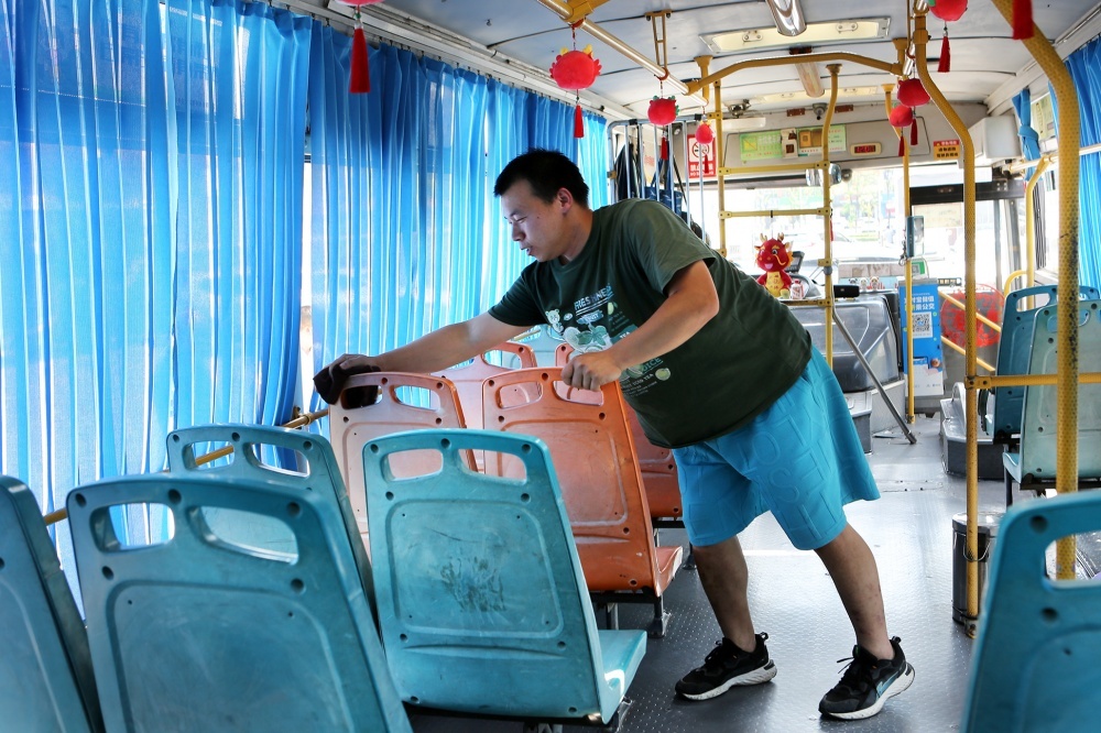 2020#車是揚(yáng)子江早年出廠的一輛“老爺車”,今年即將達(dá)到報廢年限,但走進(jìn)車廂內(nèi),地板明亮反光,車窗清晰透亮,窗簾座椅清爽整潔,更像是一輛嶄新的“空調(diào)車”,問起如何將車輛打掃得如此干凈,張峻峰講出了他的工作心得。