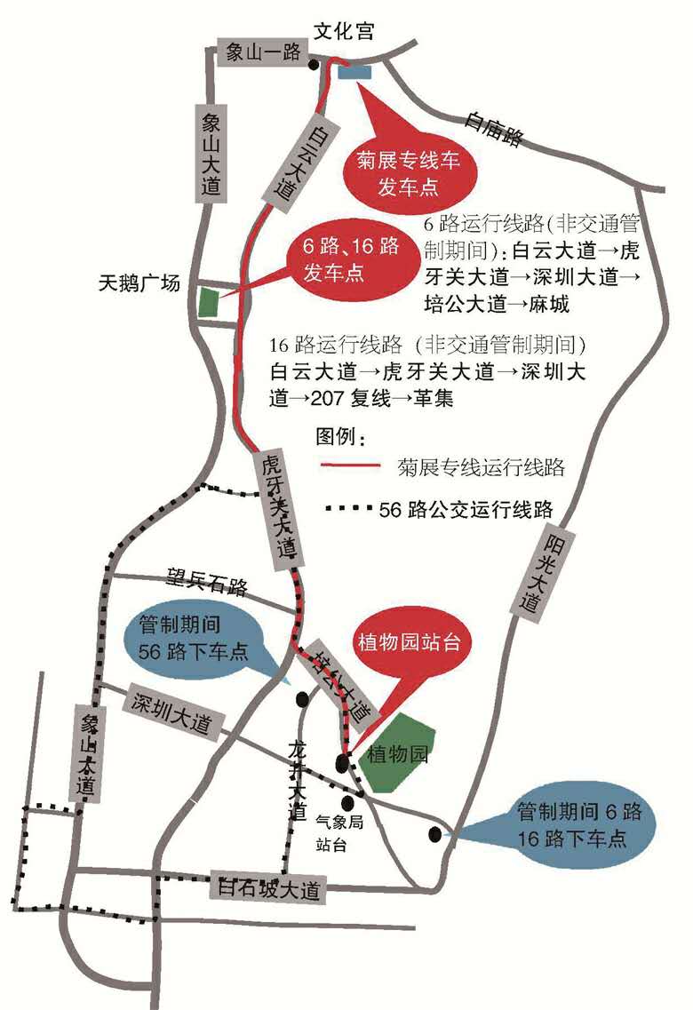 值得說明的是,菊展期間,公交按現(xiàn)行票價收費。菊展前三天,深圳大道東端、培公大道(培公大道與龍井大道交叉路口至培公大道與白石坡大道交叉路口)將實現(xiàn)交通管制,禁止公交車通行,這樣一來,上述四條公交在植物園附近的線路和停靠站點將同步調(diào)整,菊展專線公交車將??吭谂喙蟮乐参飯@出口,其他時間停靠在植物園大門附近的植物園站臺。交通管制期間,16路公交車、6路公交車將??吭诎资麓蟮罇|上下車。56路交通管制期間線路不延伸,在培公大道與龍井大道交叉路口上龍井大道,游客可在龍井大道北段上下。荊門晚報訊(記者戴永君)