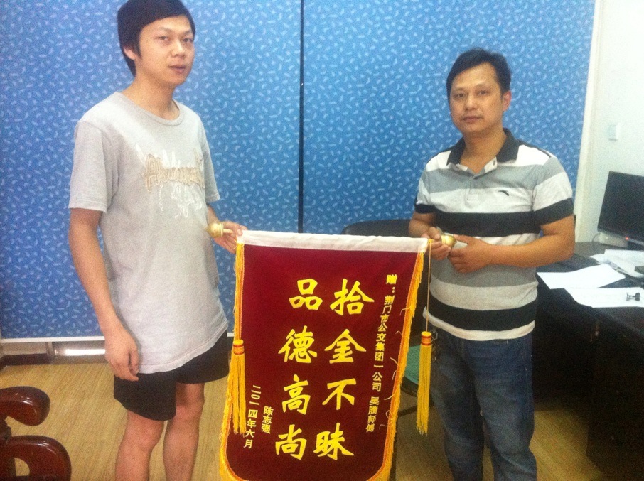 原來,15日下午2時許,1路公交車司機(jī)吳騰驅(qū)車途經(jīng)城區(qū)長寧大道長寧8號廣場(中百倉儲)公交站點(diǎn)時,在馬路中央撿到一個黑色皮包,并及時上交到公交集團(tuán)公汽一公司。公司負(fù)責(zé)人將皮包內(nèi)身份證信息通過《荊門晚報》及荊門社區(qū)網(wǎng)絡(luò)媒體發(fā)布尋找失主陳先生信息,陳先生看到招領(lǐng)信息后,很快得知錢包的下落了,他說這(找回錢包)是他萬萬沒想到的。18日上午,陳先生順利地從公汽一公司負(fù)責(zé)人手中認(rèn)領(lǐng)到丟失的錢包,并特意為吳師傅制作了一面"拾金不昧 品德高尚"錦旗表示謝意。