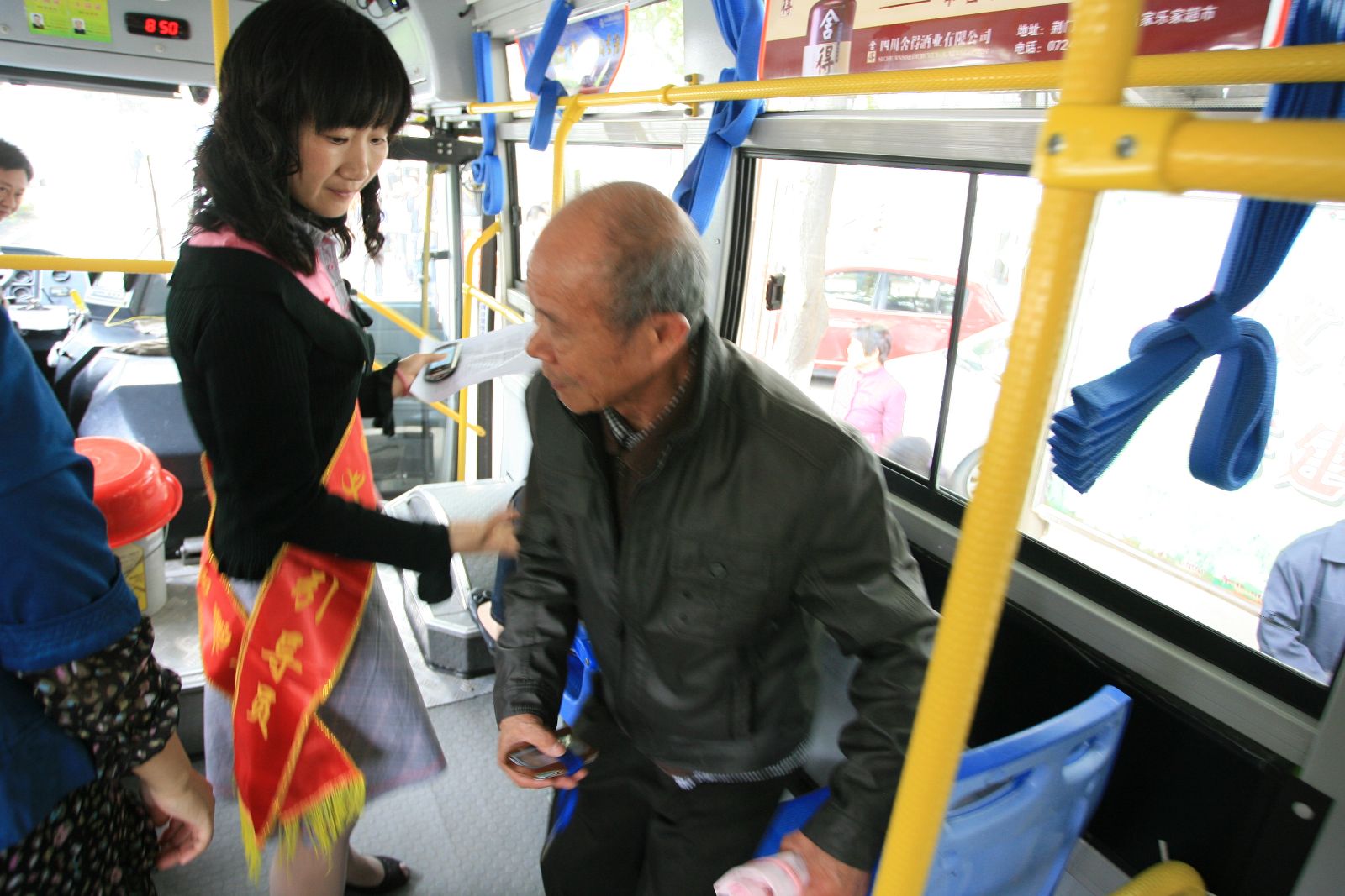 5月15日,荊門公交集團負責營運安全的3名副總經(jīng)理,帶2個營運公司20余名管理人員、以及10名身披綬帶的志愿者引導員在城區(qū)的一醫(yī)、中商、東方百貨、移動公司、汽車站5個公交站點正式啟動“文明進公交”活動。
