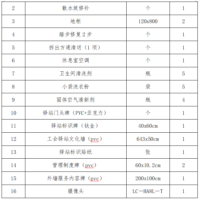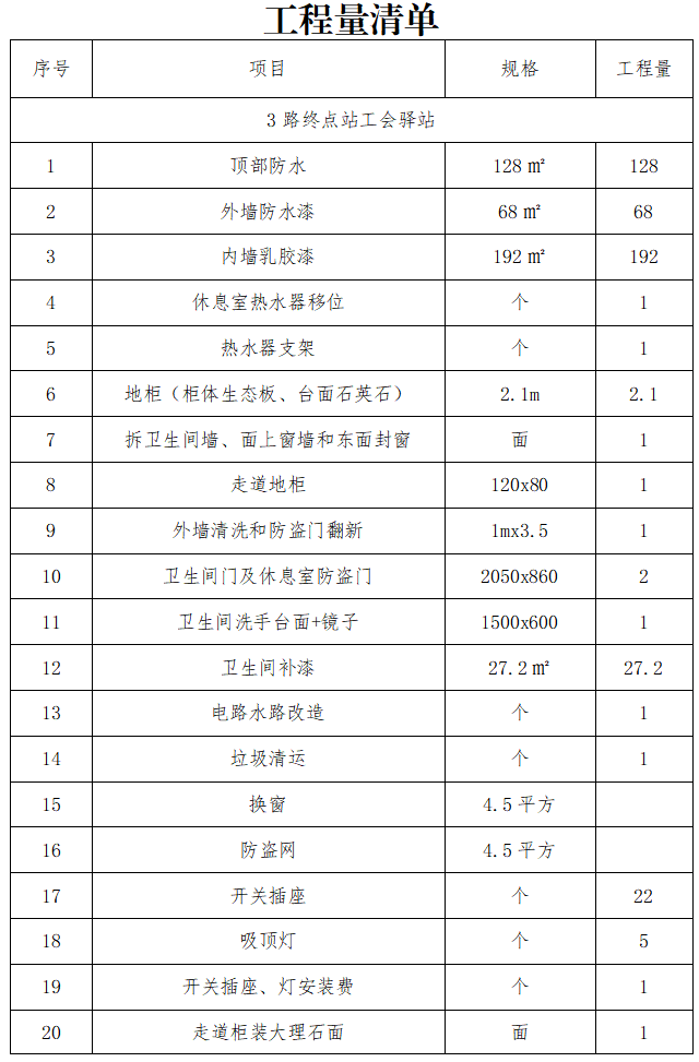 工程內(nèi)容:3路、8路終點(diǎn)站及出租車駕駛員休息驛站,統(tǒng)一規(guī)劃、整合升級,具體內(nèi)容詳見工程量清單(附件)。