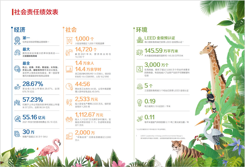 7月18日,中國(guó)旅游集團(tuán)中免股份有限公司以中英文雙語(yǔ)的形式,披露了公司上市以來(lái)的首份ESG報(bào)告——《2021年度環(huán)境、社會(huì)及管治報(bào)告》。公司以不斷滿足消費(fèi)者日益增長(zhǎng)的對(duì)美好生活的追求為使命,在推動(dòng)公司高質(zhì)量發(fā)展的同時(shí),積極以行業(yè)道德行為和成果貢獻(xiàn)回饋社會(huì),成績(jī)斐然。